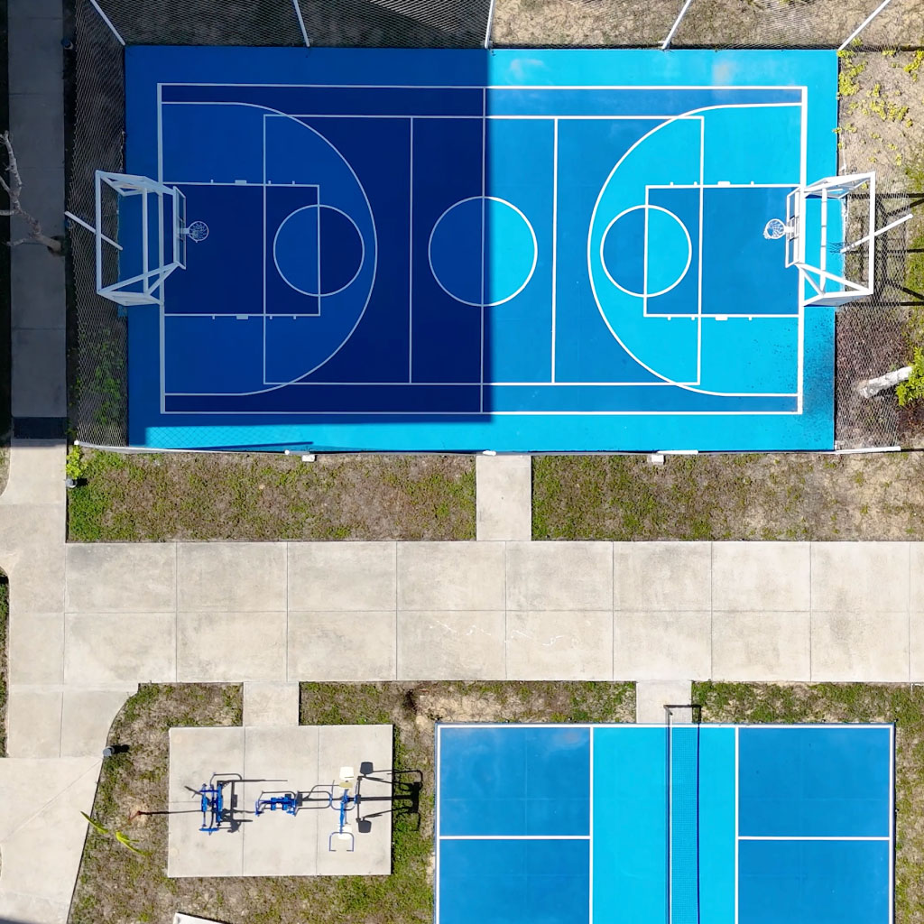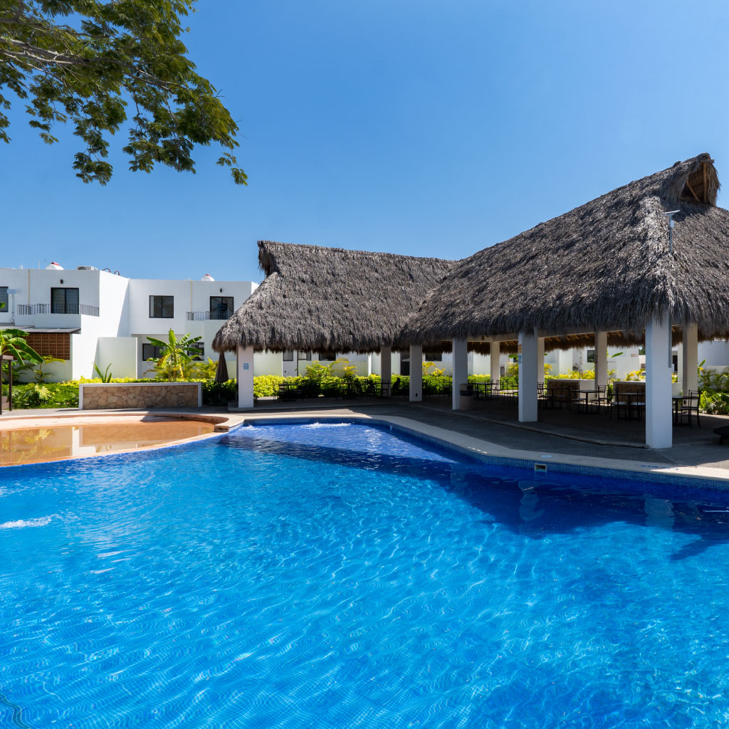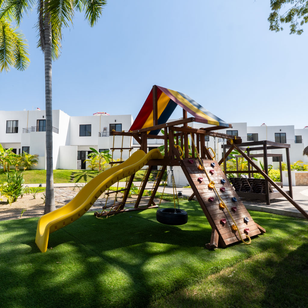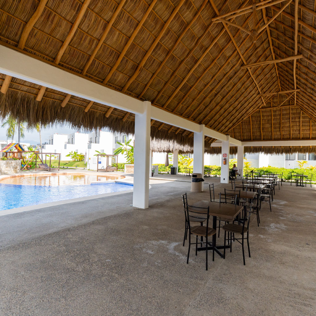 Alberca, palapa club, multicancha y juegos infantiles